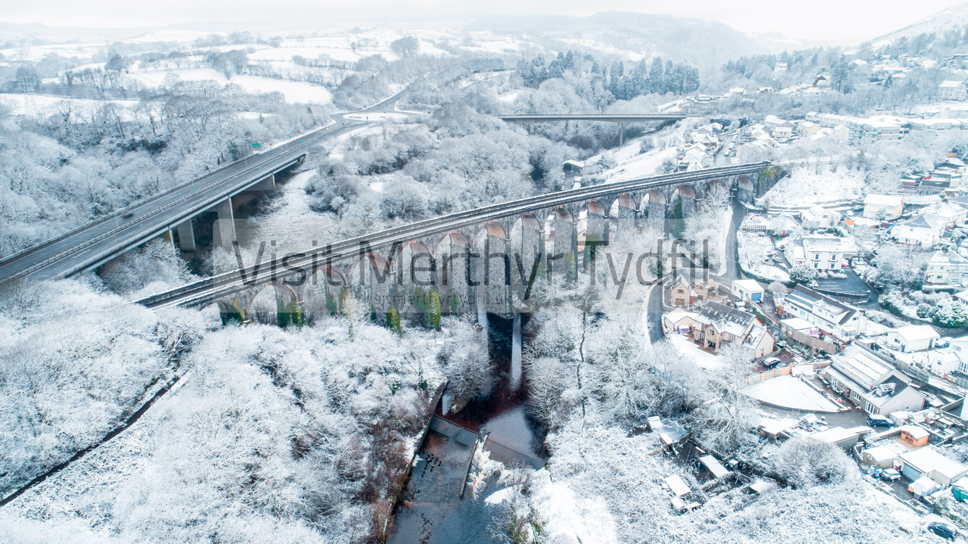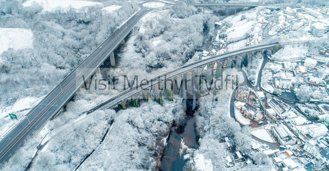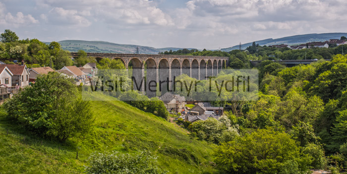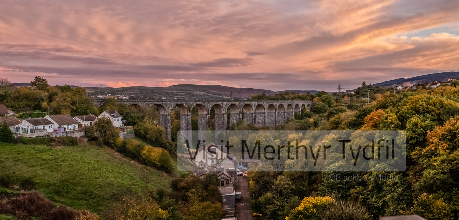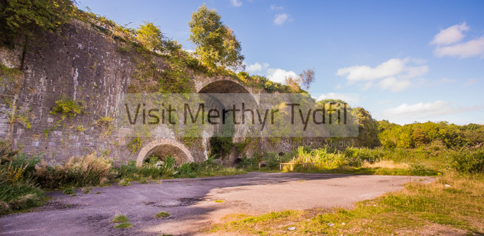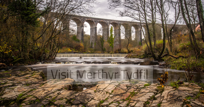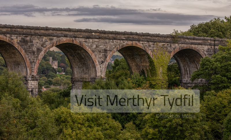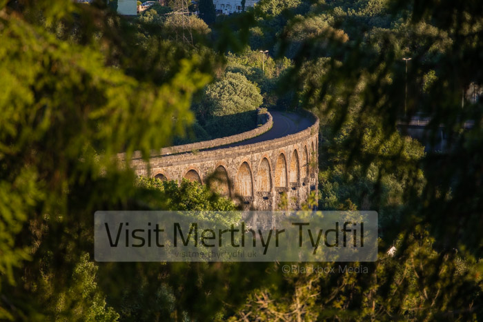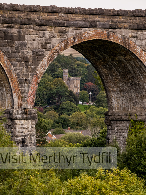 A unique view of the Cefn Coed viaduct with Cyfarthfa Castle framed in one of the arches